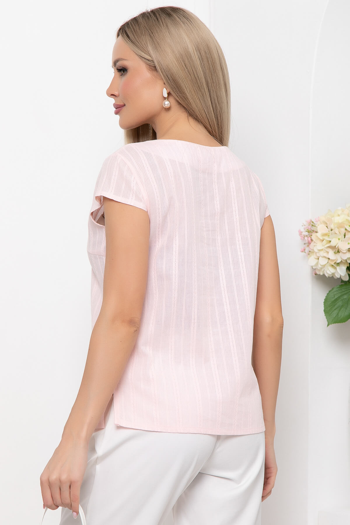 Женственная блуза в нежном розовом оттенке создаст элегантный классический образ. Блуза свободного кроя с разрезами по бокам. Округлый вырез горловины, декорирован вырезом "капелька". Рукав втачной, короткий.