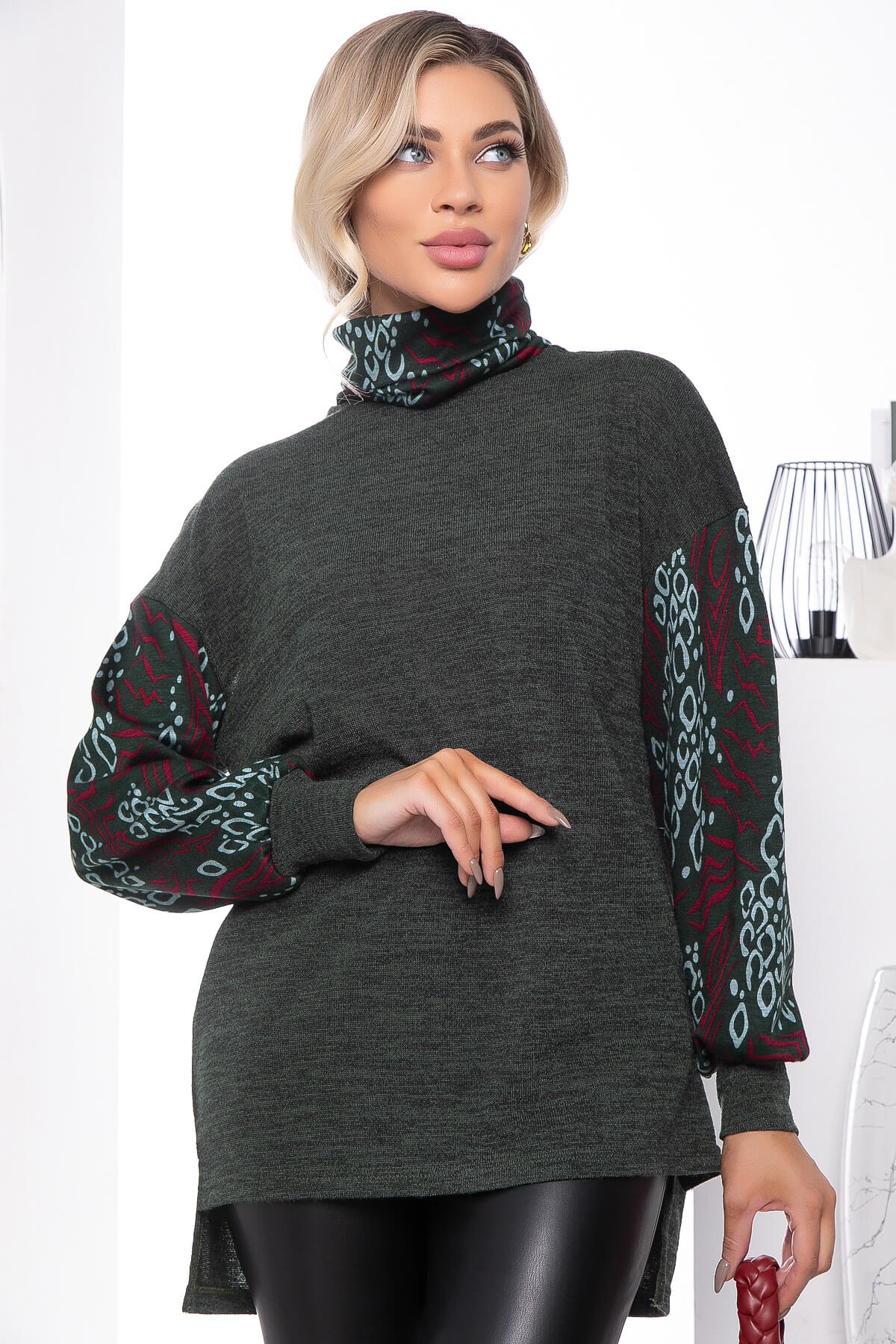 Тёплый и уютный джемпер из трикотажа с добавлением шерсти. Джемпер удлиненный и поэтому хорошо будет смотреться в сочетании с облегающими брюками или лосинами. Плечевой шов спущен, длинный втачной рукав на манжете.