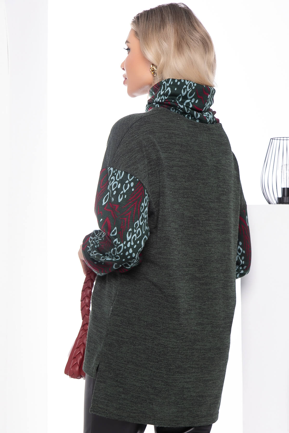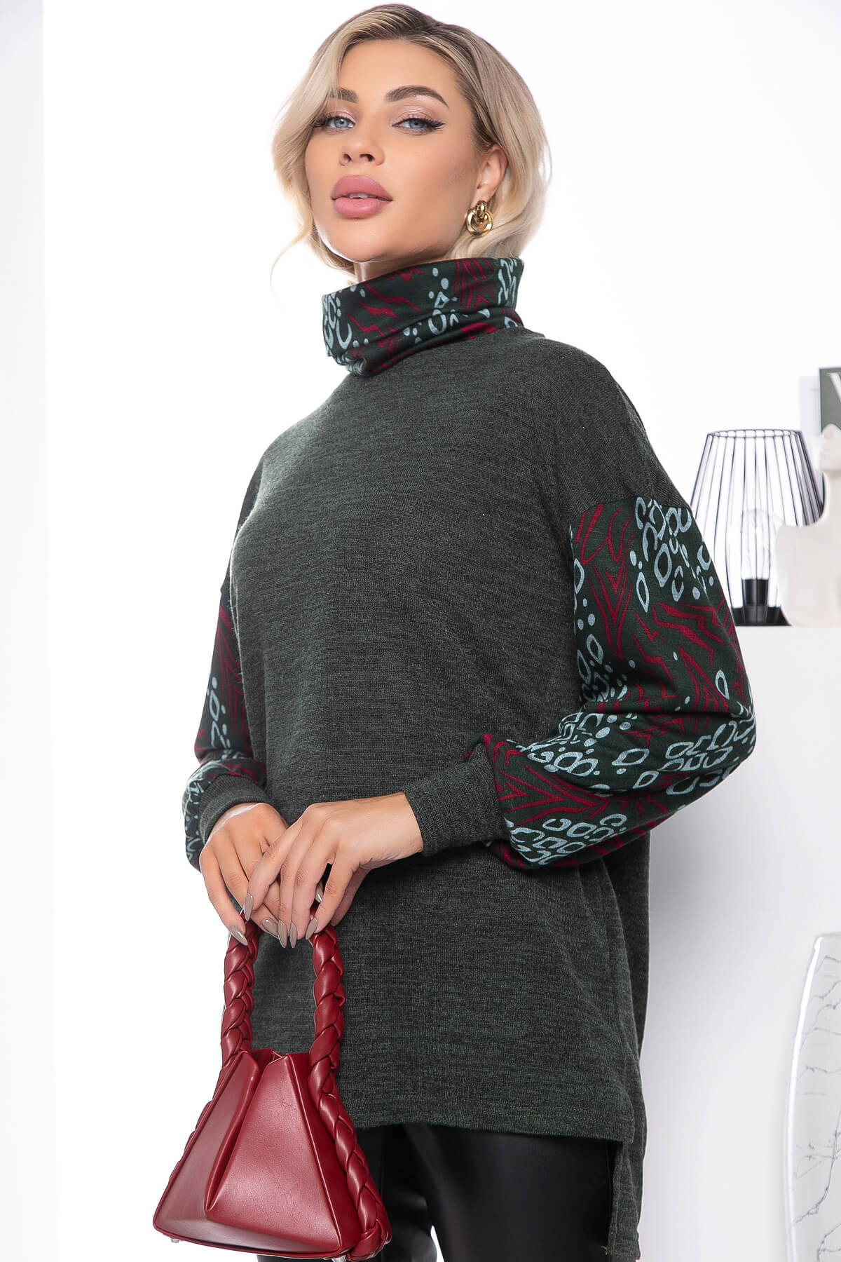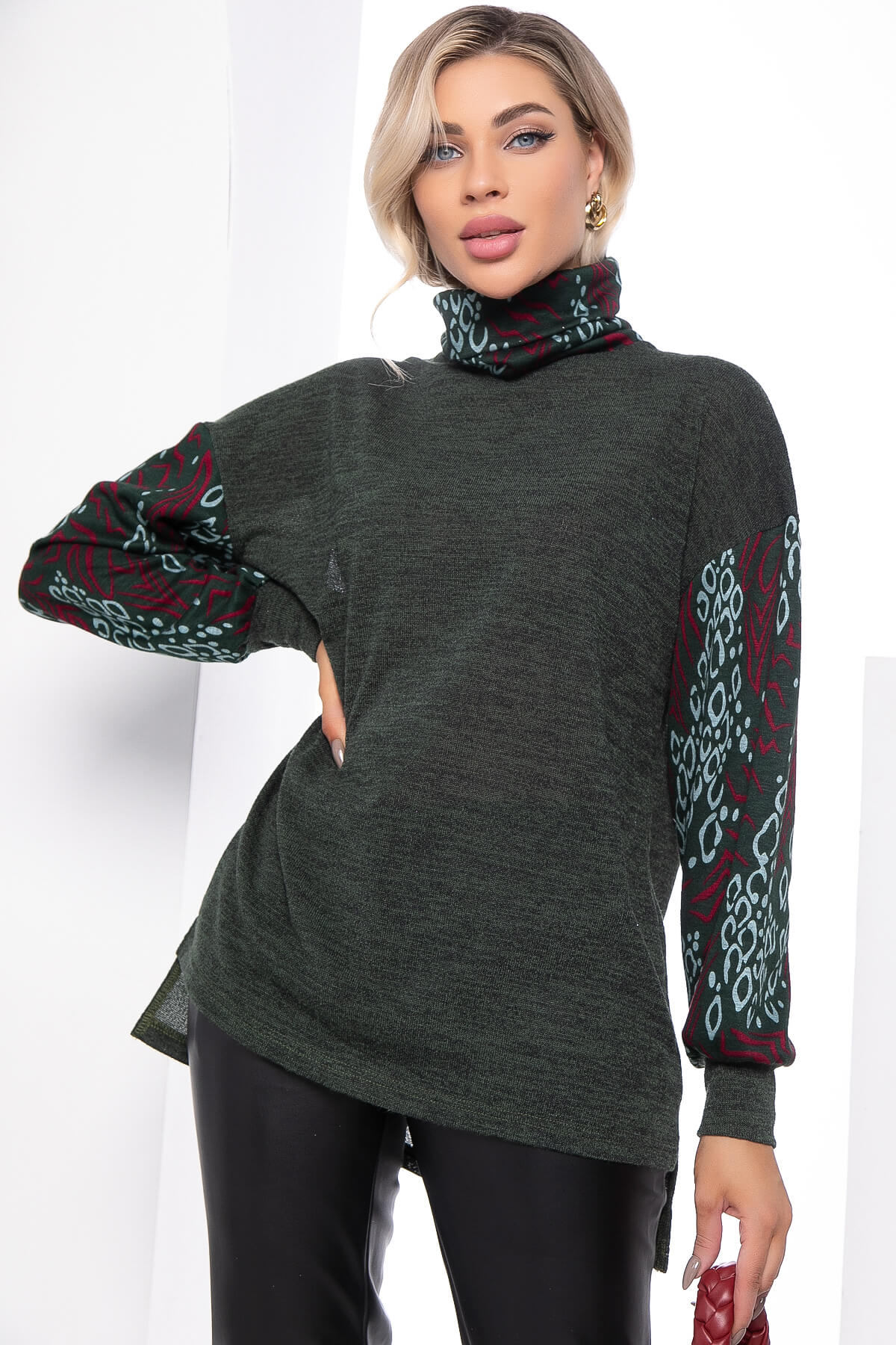 Горловина оформлена воротником "Хомут". По бокам джемпера есть разрезы.