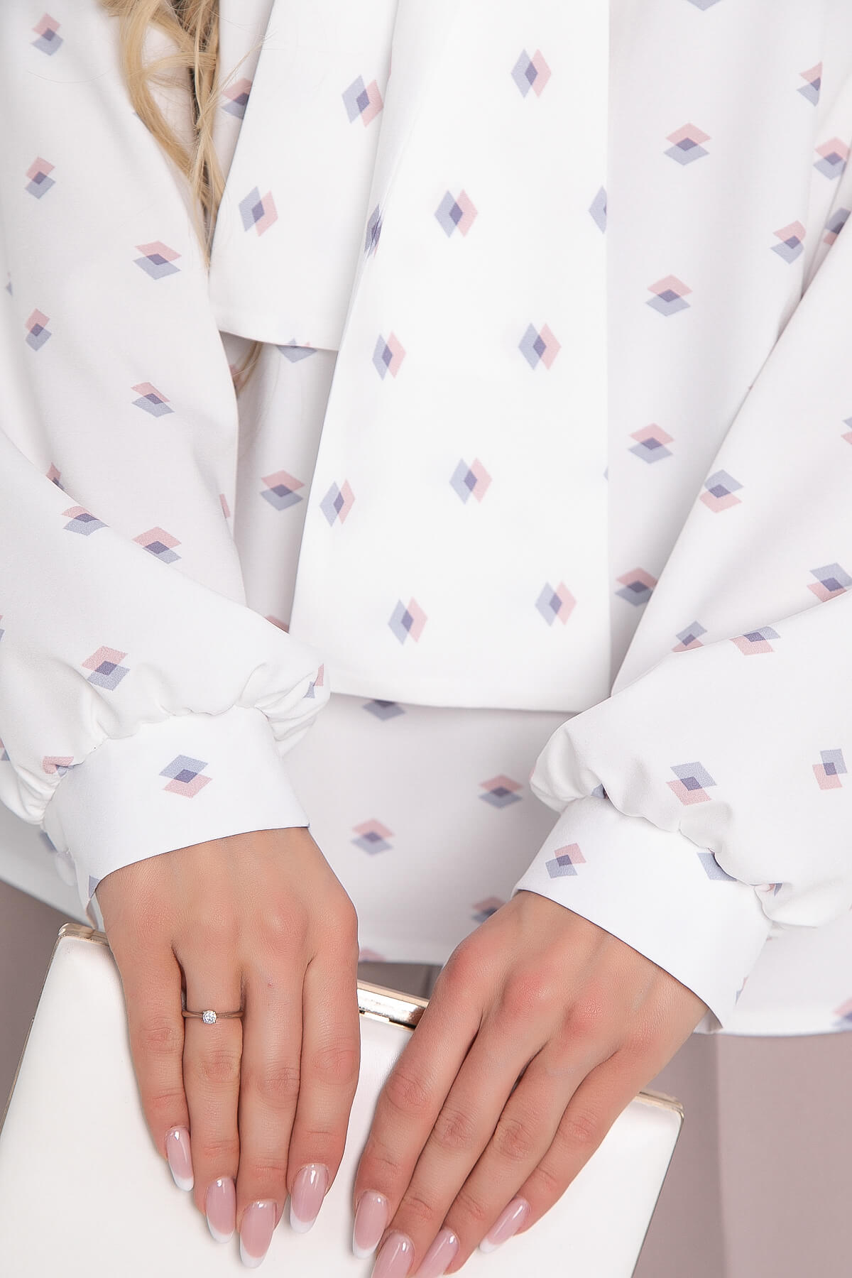 Блуза свободного силуэта, выполненная из приятной к телу ткани с мелкими ромбиками. Такая модель блузы хорошо будет сочетаться с Вашим деловым гардеробом. Рукав втачной, длинный, по низу рукава манжет. По передней части горловины ворот украшен бантом. При помощи такой блузы Вы с лёгкостью сможете украсить свой офисный образ.