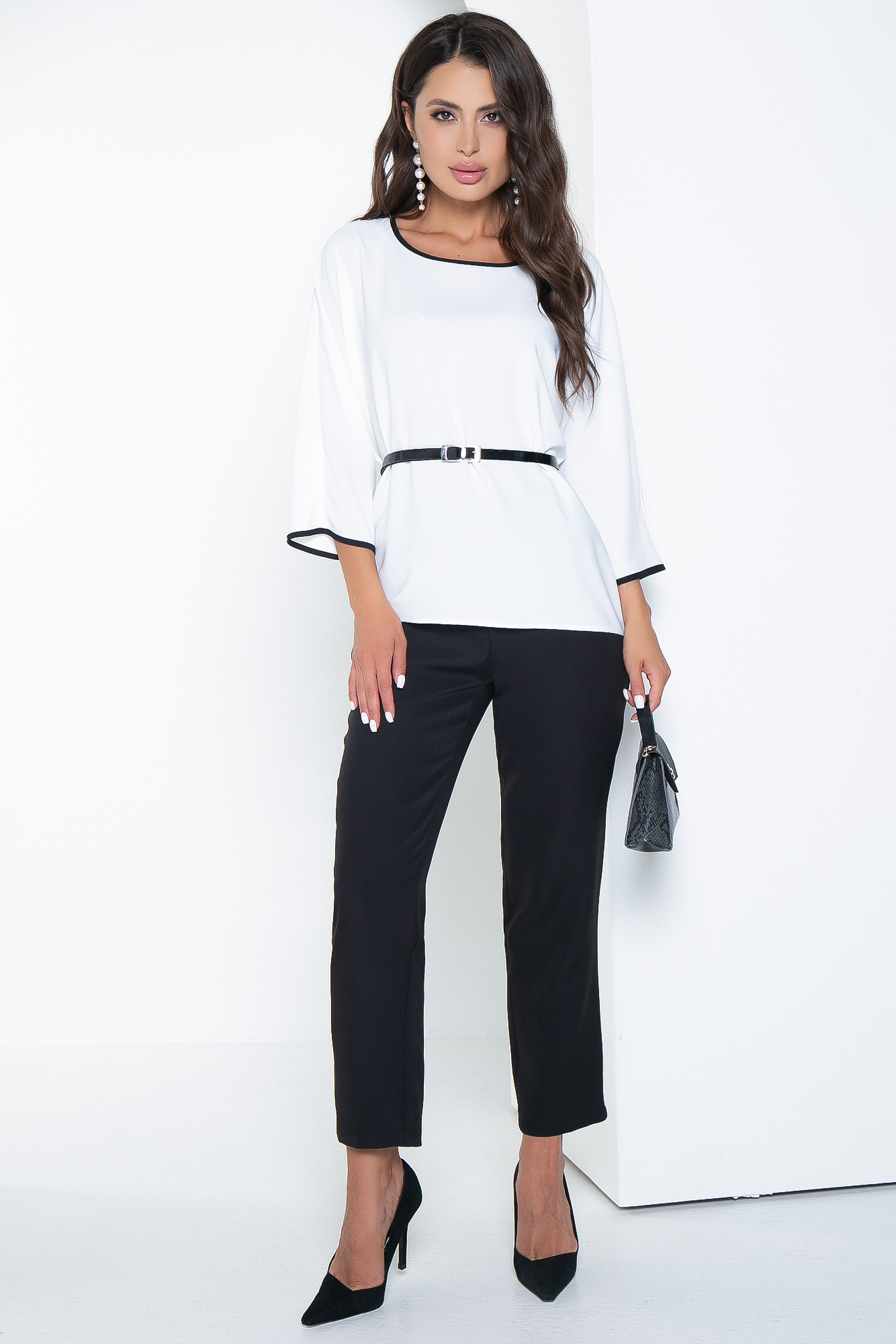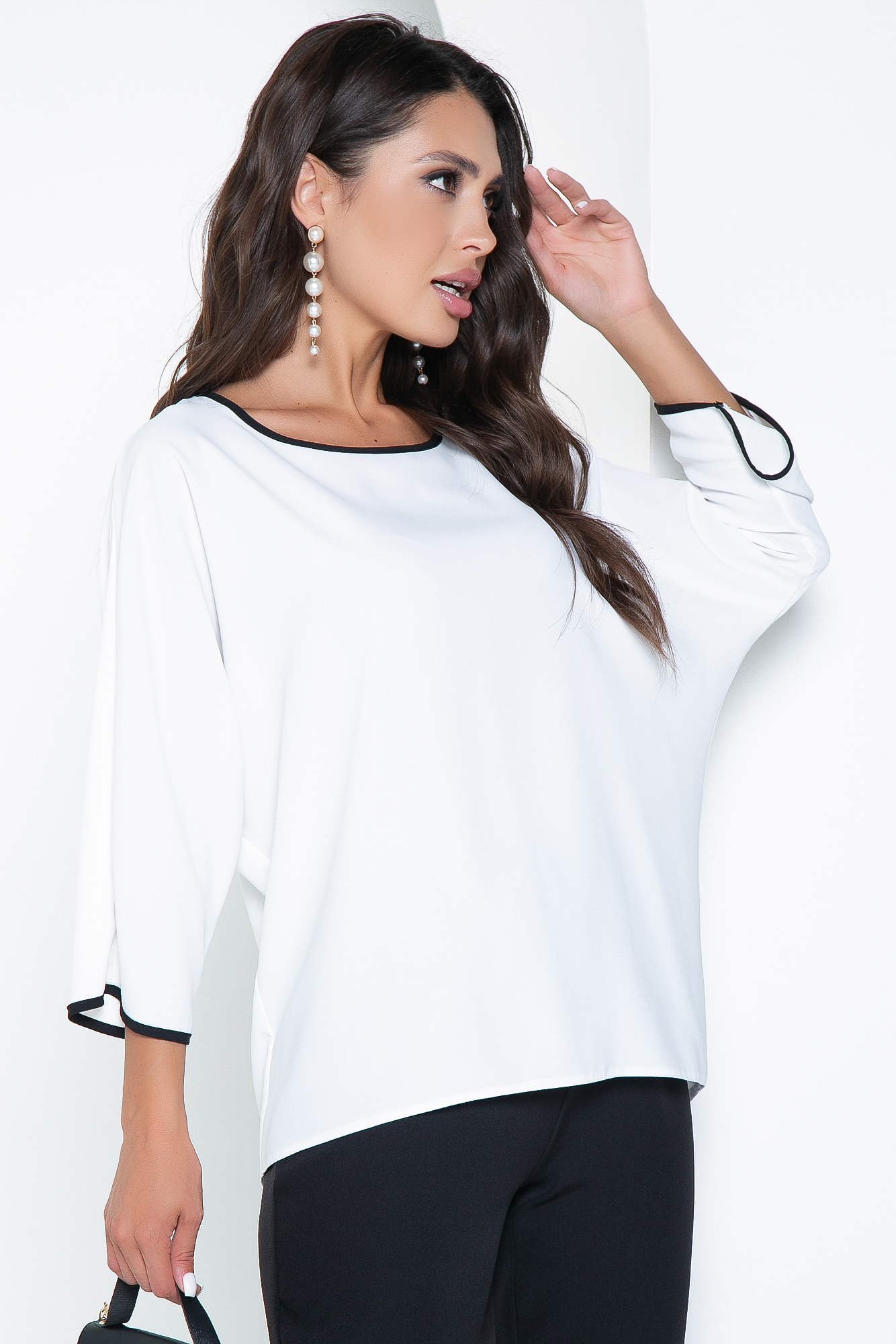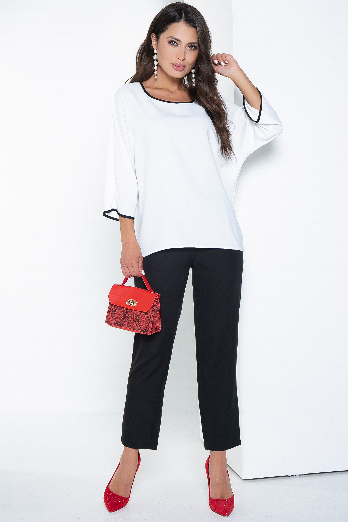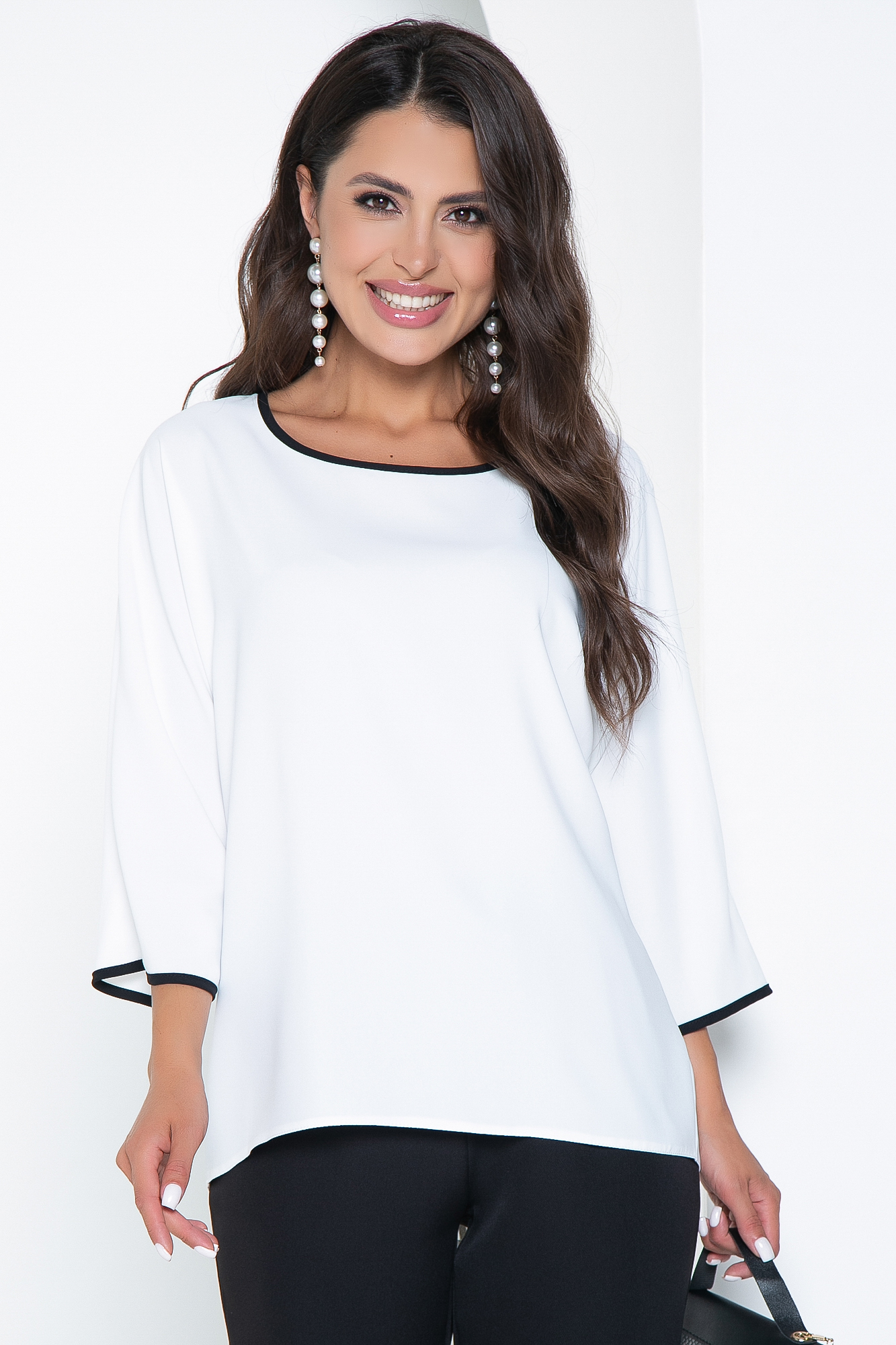 - Блуза свободного кроя, вырез горловины округлый, обработан черной окантовкой;