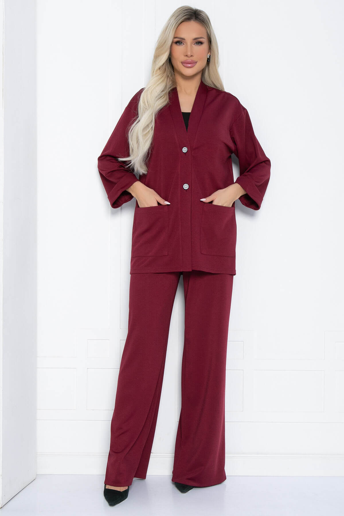Женский брючный костюм полуприлегающего силуэта — это превосходный выбор для тех, кто стремится выглядеть элегантно и при этом оставаться в комфорте в любую погоду. Жакет с пуговицами и слегка приспущенными рукавами обеспечивает полную свободу движений, позволяя вам чувствовать себя уверенно и свободно. Брюки палаццо с резинкой на талии и карманами добавляют практичности и удобства, что делает этот костюм поистине универсальным и подходящим для различных ситуаций.