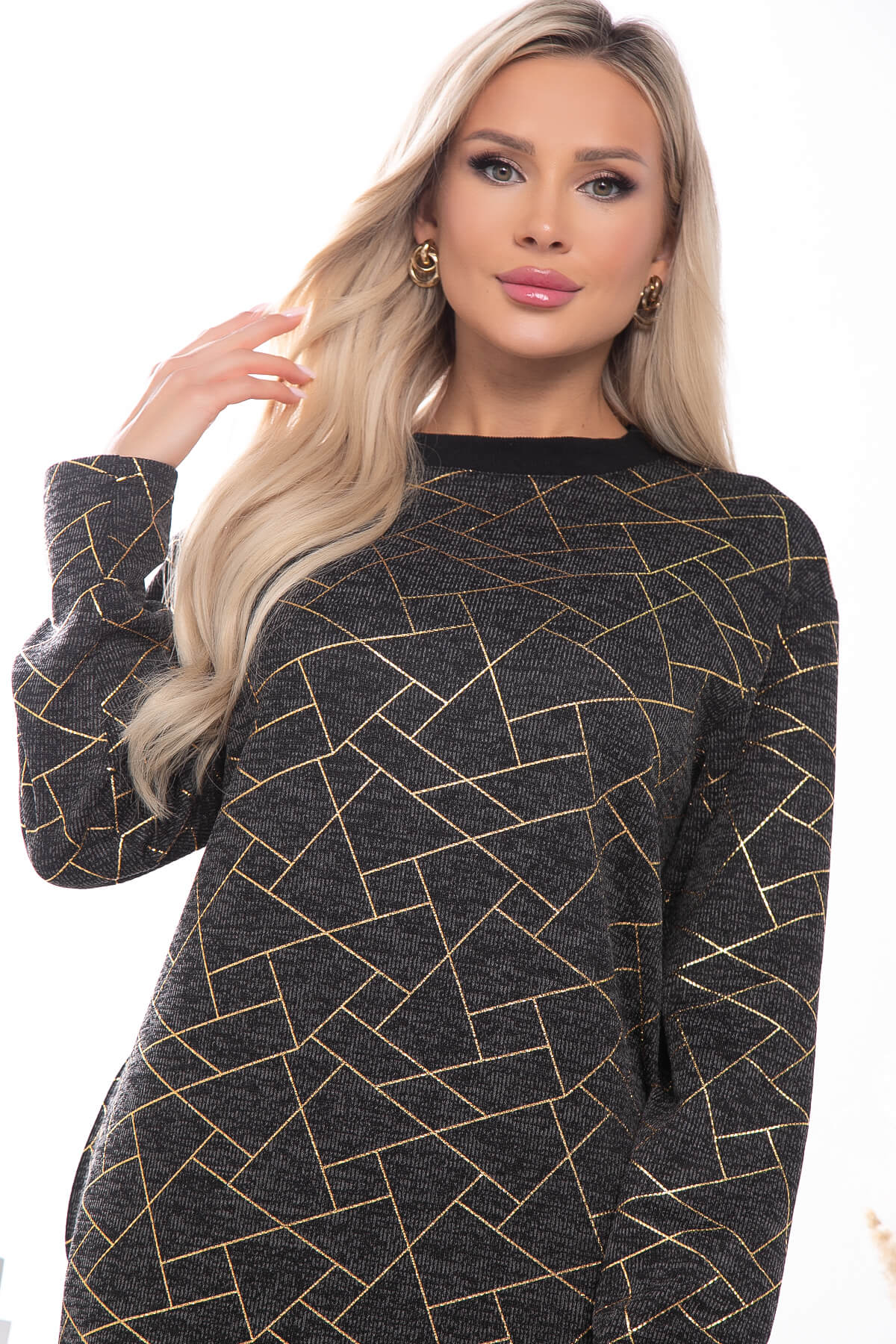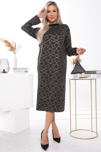 Платье для комфортного повседневного образа. Такие вещи очень универсальны и всегда выручают в ситуации, когда не знаешь, что надеть. Платье прямого кроя свободного силуэта. Рукава длинные со спущенным плечевым швом. Изделие украшает принт с вставками золотого цвета. В боковых швах есть карманы.