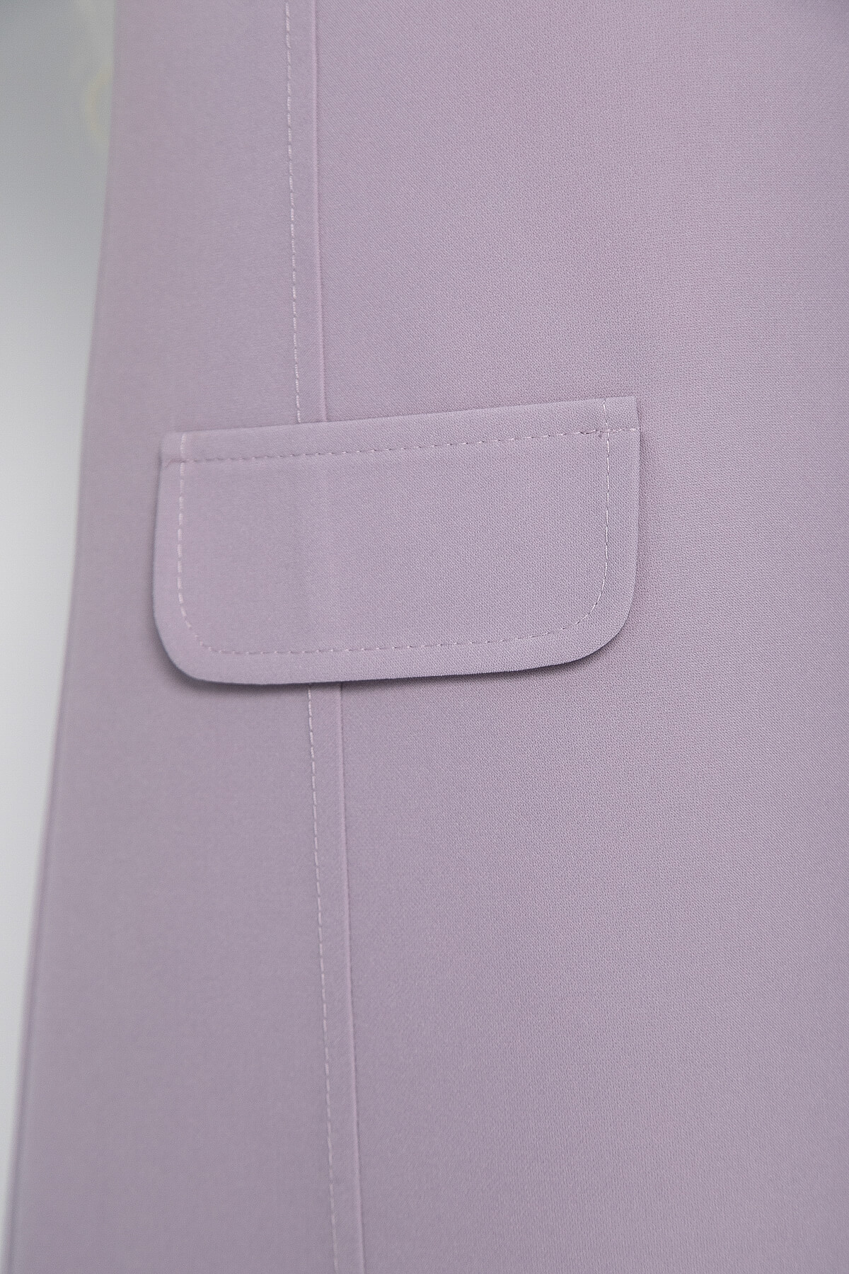Платье в лиловом оттенке – идеальный вариант для деловых встреч и торжественных мероприятий. Его короткая длина зрительно удлиняет ноги, особенно если дополнить образ обувью на каблуке. Платье украшено декоративными клапанами спереди.