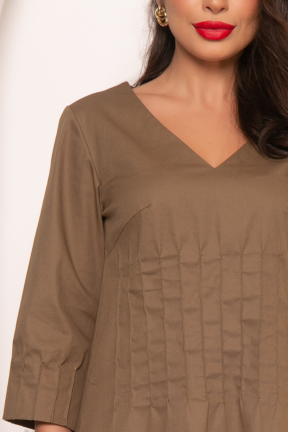 Оригинальное платье полуприталенного силуэта с красиво оформленной линией талии. Лаконичное платье средней длины на каждый день. Рукав втачной, три четверти. В комплекте пояс из основной ткани.