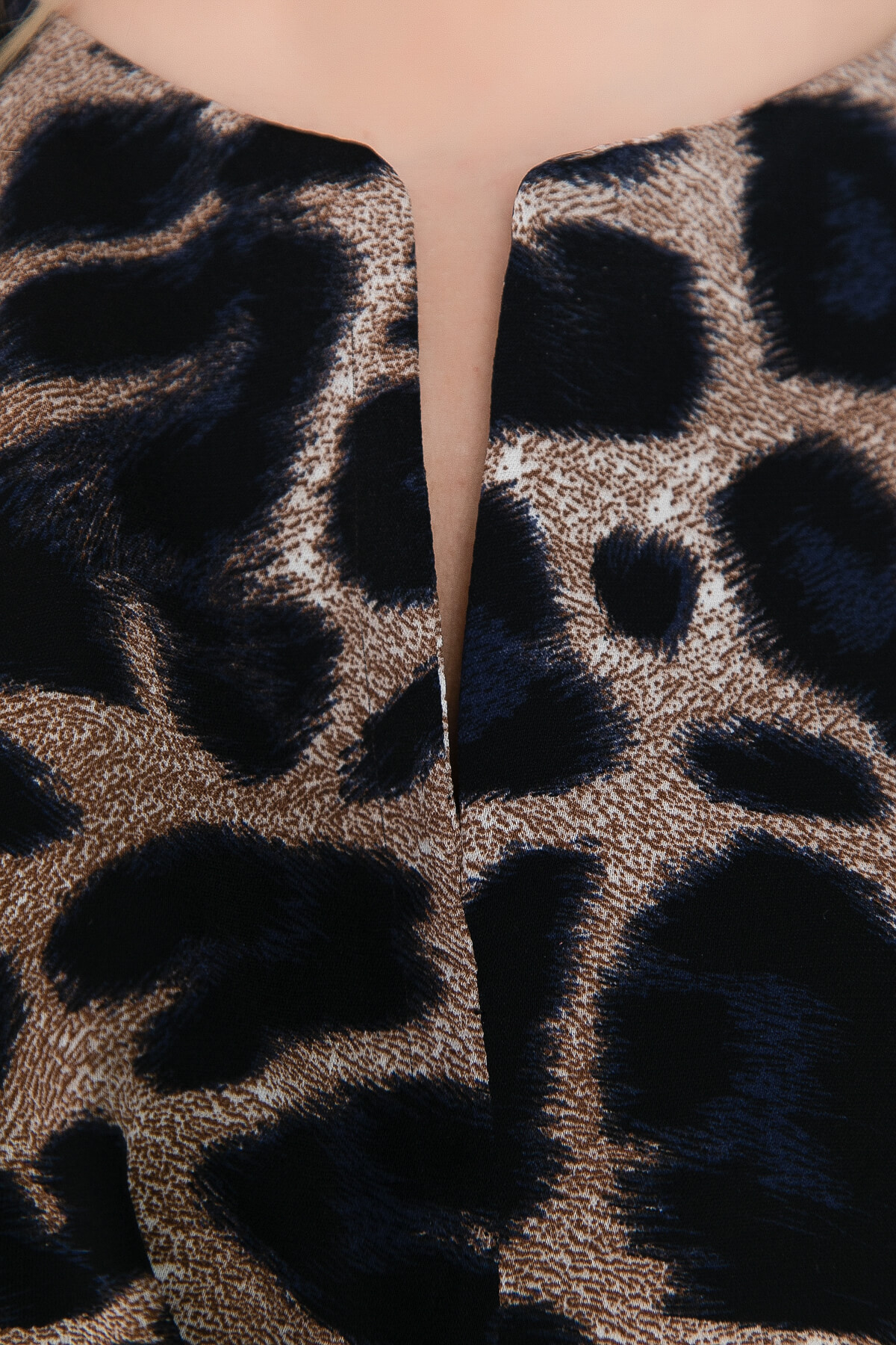 Блуза свободного силуэта, выполненная из приятной к телу ткани в трендовом принте "Леопард", который хорошо будет сочетаться с любым гардеробом. Рукав втачной, длинный, низ рукава на резинке. При помощи такой блузы Вы с лёгкостью сможете украсить свой офисный образ. Вырез округлый с акцентным разрезом. Особый шарм придает втачной пояс.