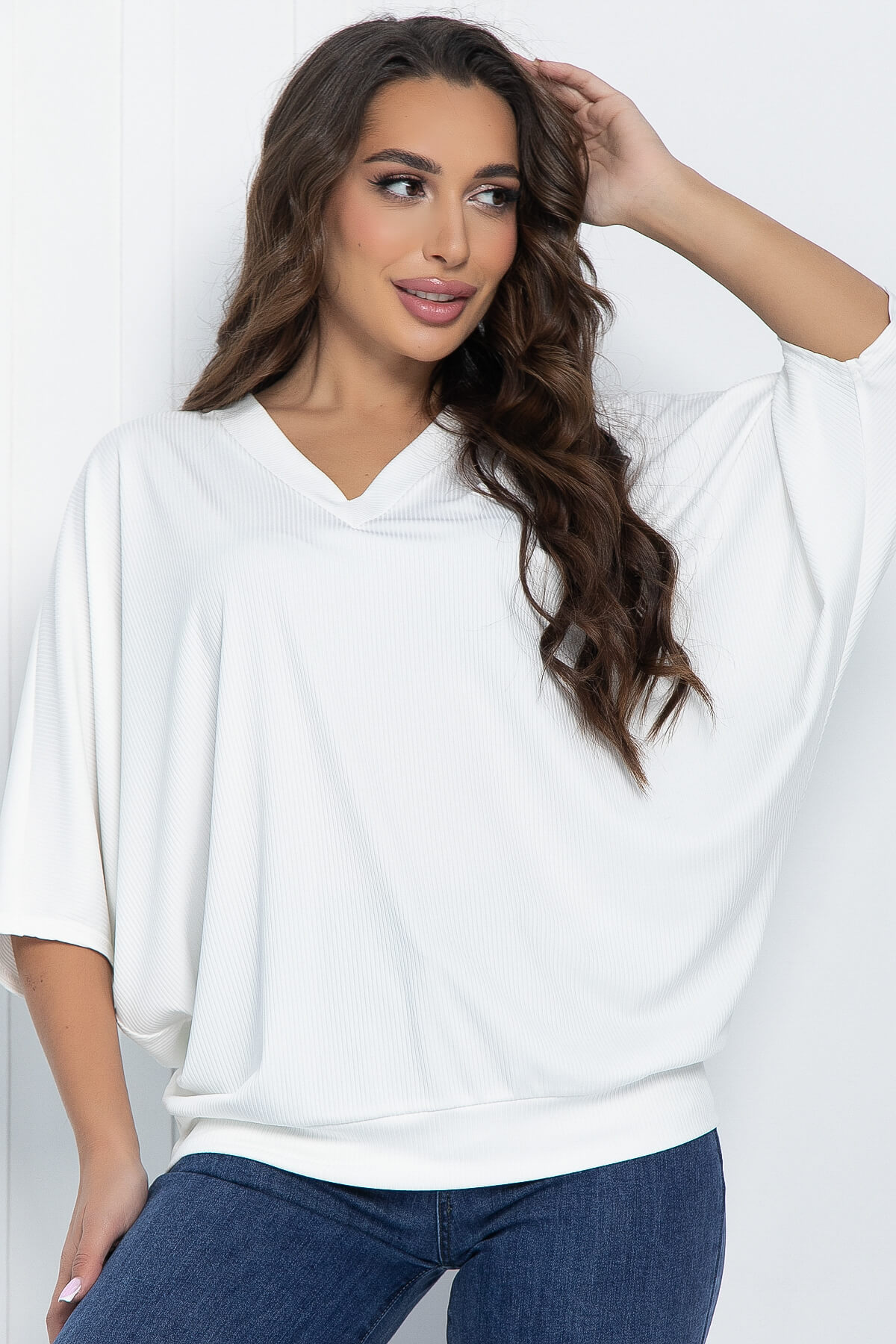 Блуза имеет интересный дизайн с V-образным вырезом горловины и удобным цельнокроеным рукавом «летучая мышь» длины ¾ . Важное преимущество такого рукава заключается в его способности скрывать различные погрешности фигуры. Обладая женственной привлекательностью, подойдет к классической офисной и к деловой повседневной одежде.