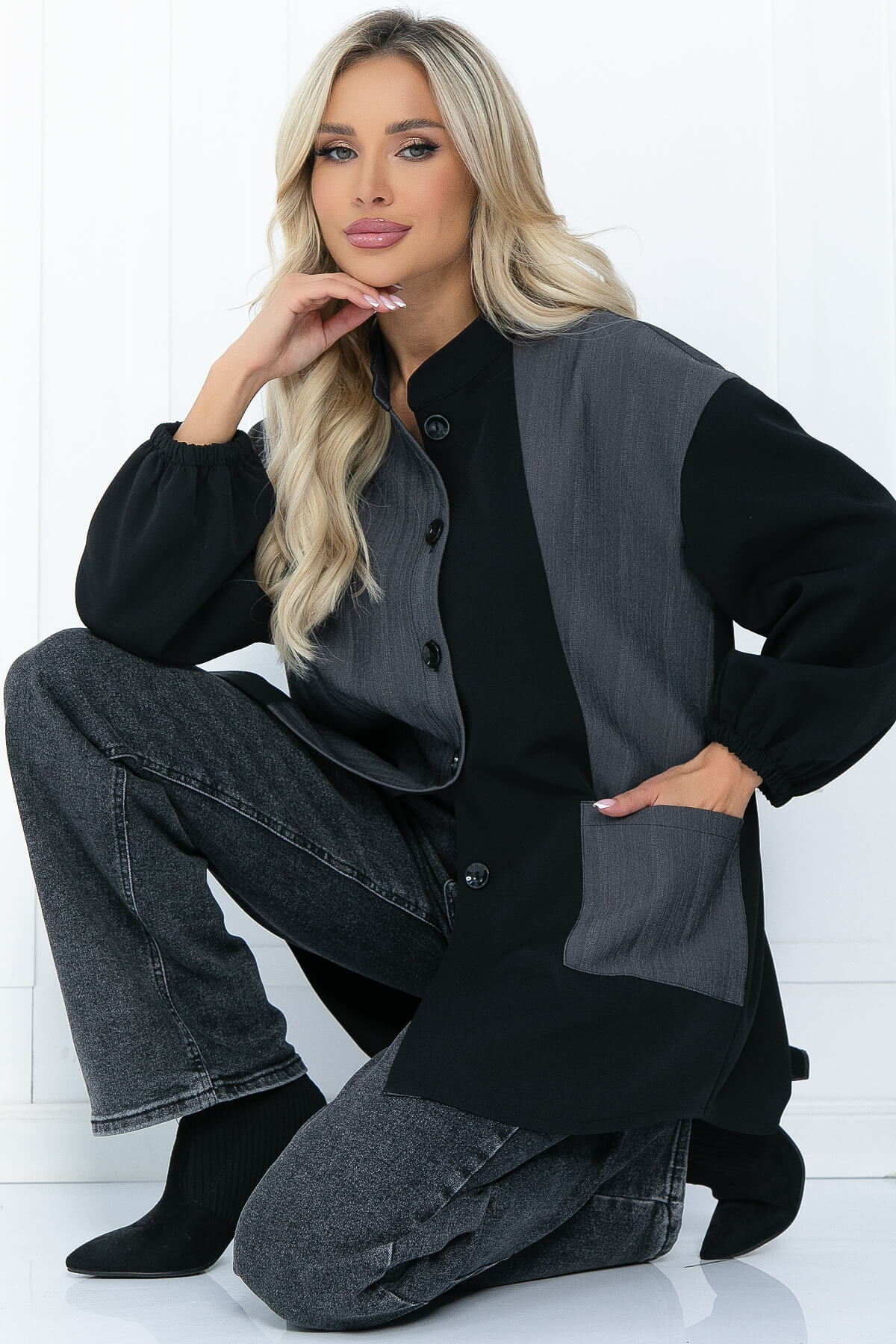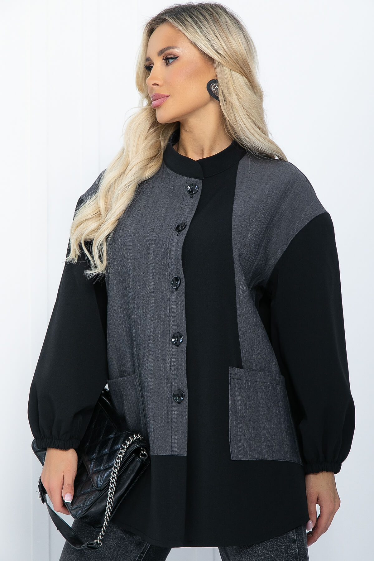 Удлиненная рубашка — это не только практичная, но и универсальная вещь, которая станет основой вашего гардероба. Модель свободного прямого кроя выполнена из плотной ткани и отличается уникальным сочетанием цветов, что делает её подходящей для любой девушки. Основной цвет рубашки — чёрный, а кокетка, карманы и полоски — серые. Воротник — стойка, плечи спущенные, рукав внизу на резинке. Спинка немного длиннее, что придаёт изделию стильный и современный вид.