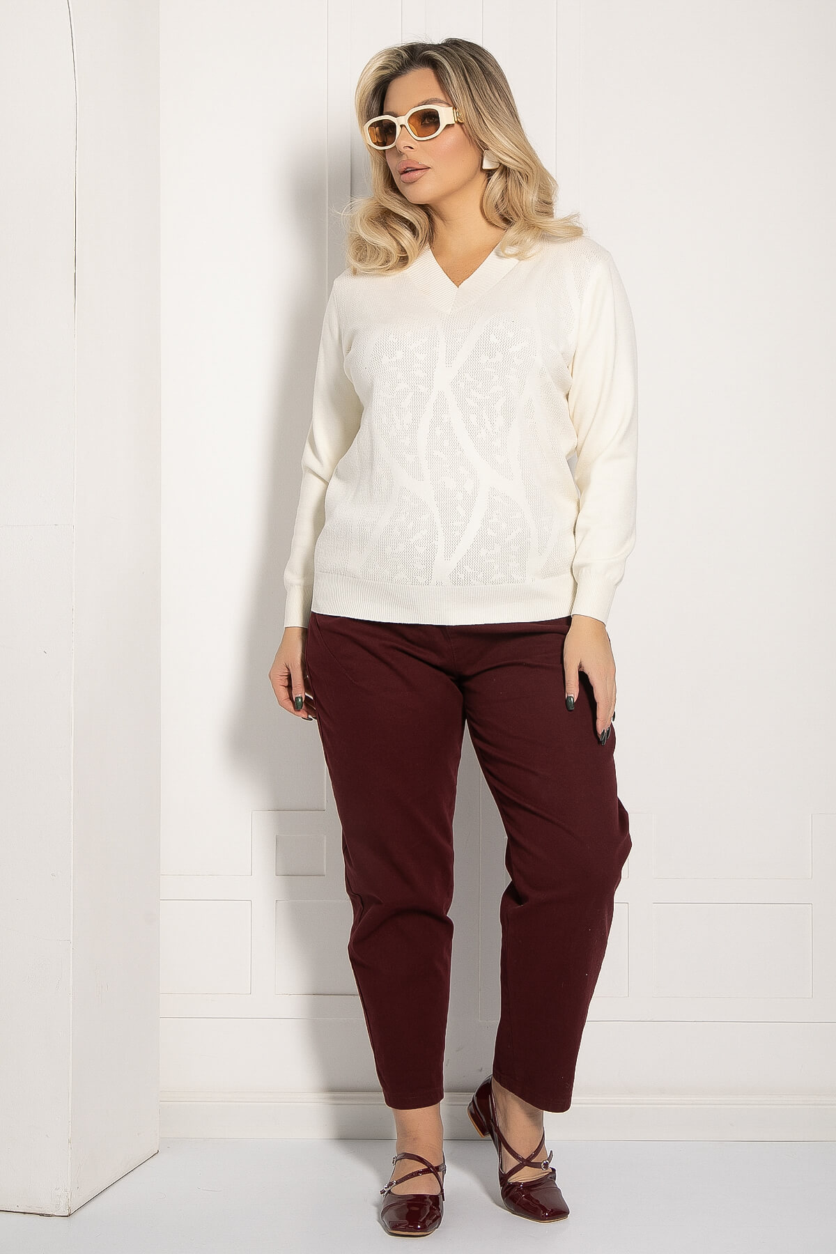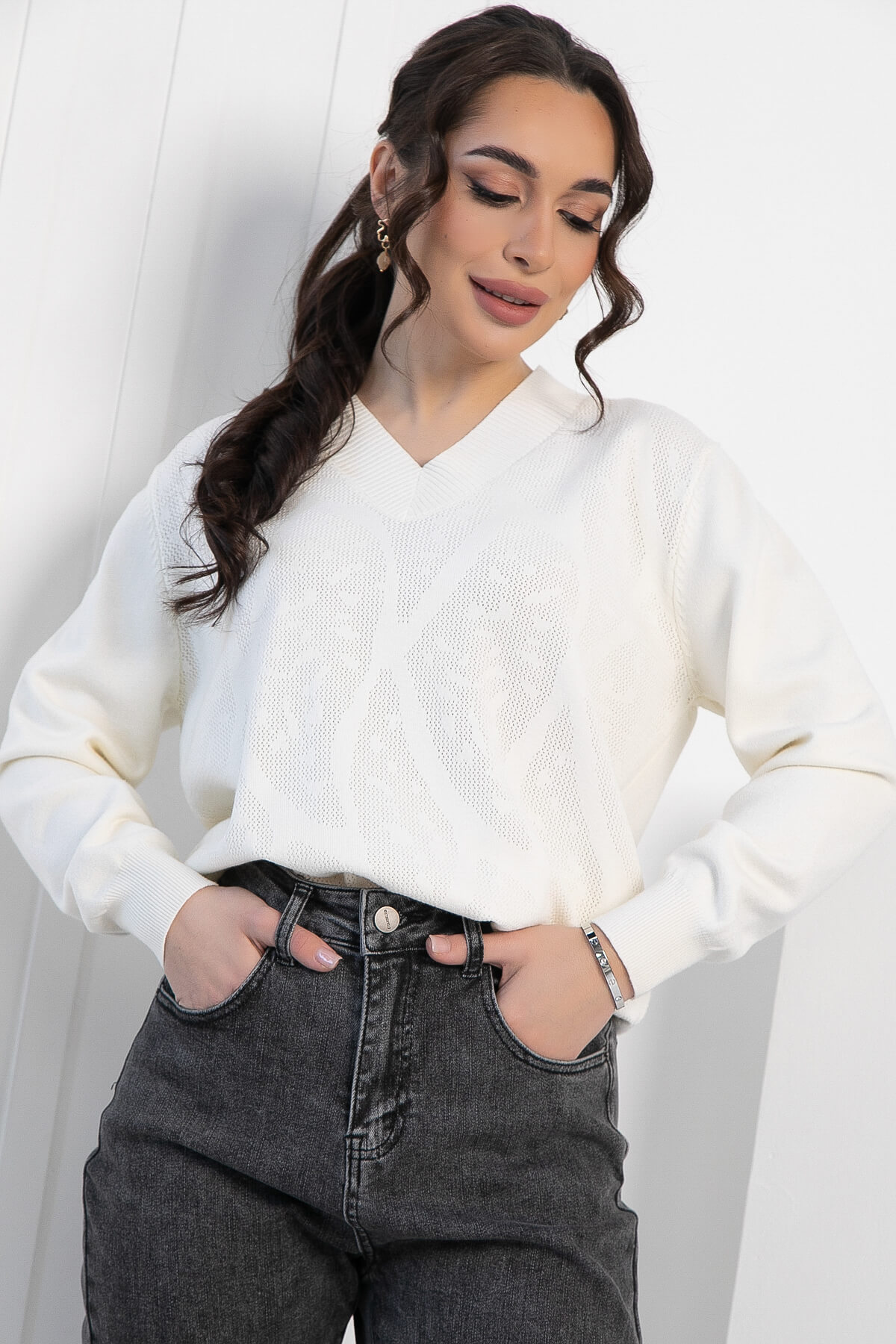 Женский джемпер в оттенке айвори, с декоративной вязкой на передней части изделия. Горловина украшена V-образным вырезом, а рукава втачные. Эта модель прекрасно дополнит любой гардероб и станет его основой для осенне-зимнего сезона. Носите джемпер как самостоятельный предмет одежды или как второй слой поверх топов и рубашек.