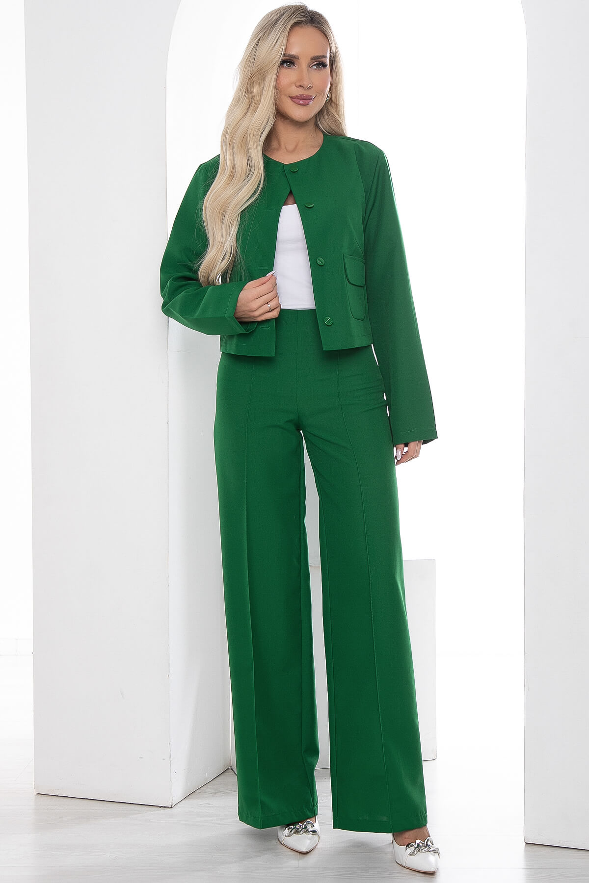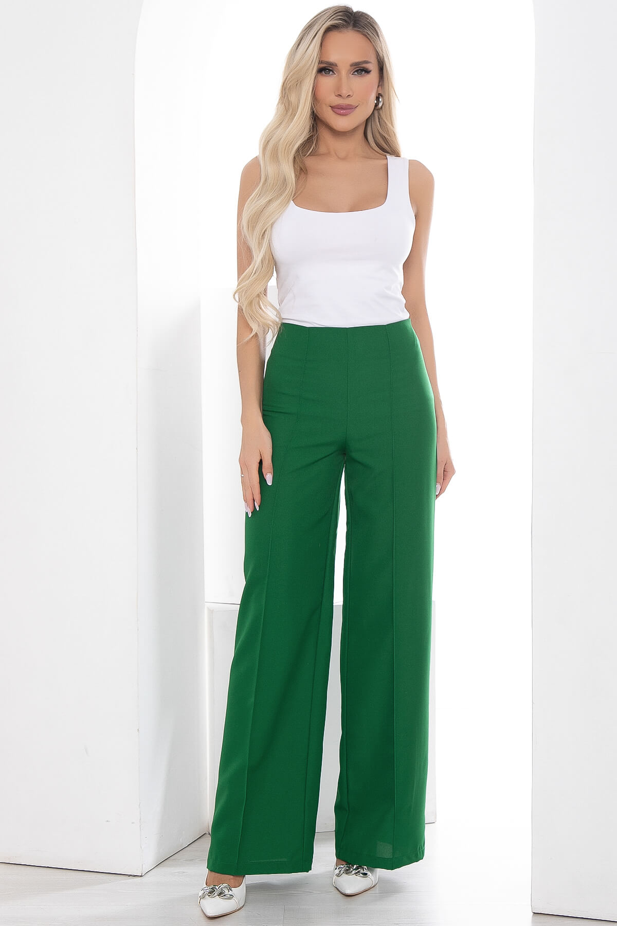 Широкие и комфортные брюки дополнят капсулу в гардеробе современной женщины. Брюки со стрелками делают образ элегантным, идеально сидит на фигуре любого типа благодаря завышенной линии талии, а также отстроченным и заутюженными стрелками по всей длине переда, которые визуально стройнят и вытягивают ноги, делая их длиннее. Эти брюки - идеальный выбор для создания офисных или повседневных образов. В боковом шве потайная молния. Создавайте множество модных образов, подбирая разнообразные верха и играя аксессуарами! Без подкладки.