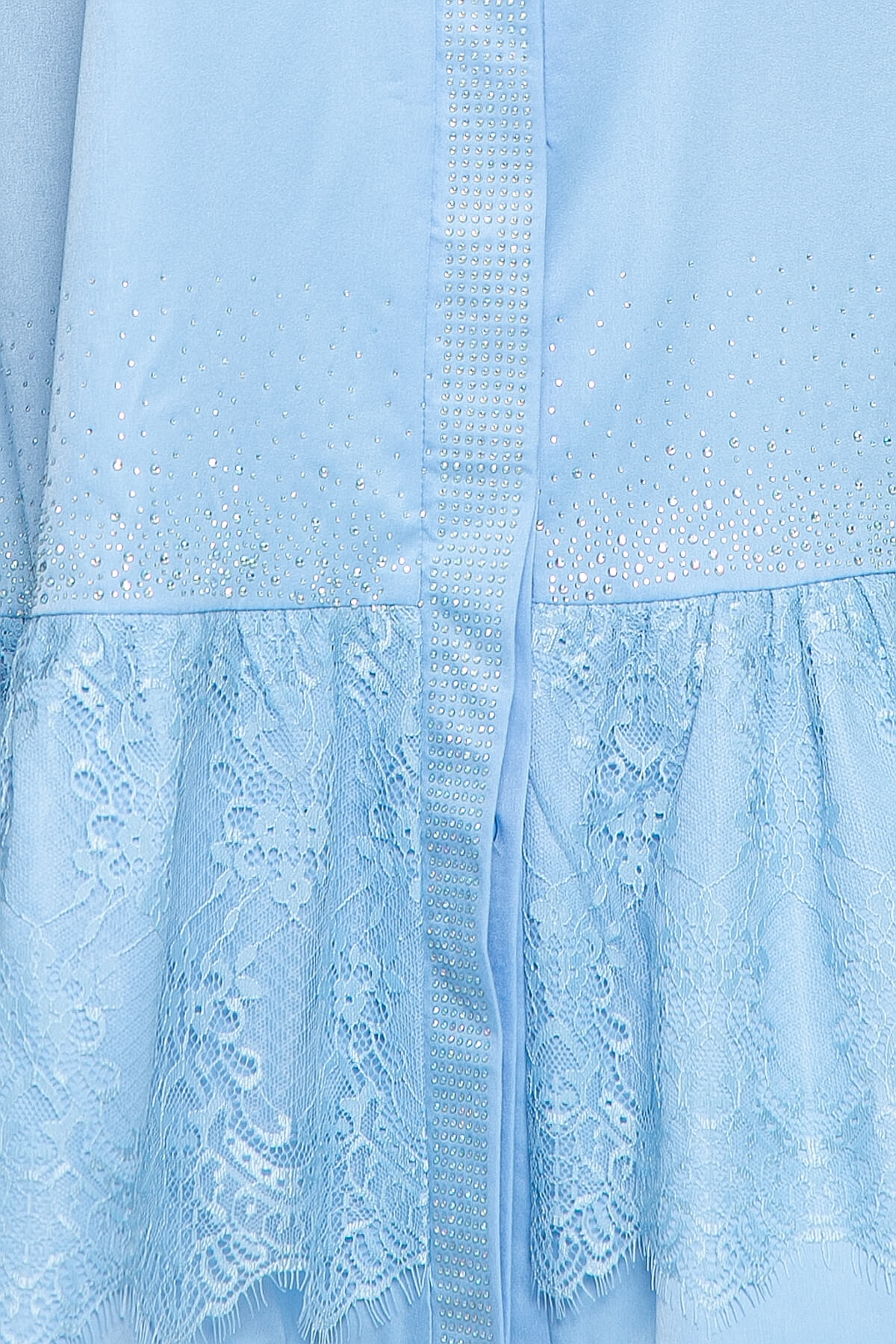 Платье в стиле ваших желаний: искрящееся, женственное, комфортное и практичное. Вечернее платье А-силуэта с широким воланом, украшенным гипюром в тон. По переду - супатная застёжка, украшенная термостразами. Рукав втачной, три четверти. Платье без подкладки.