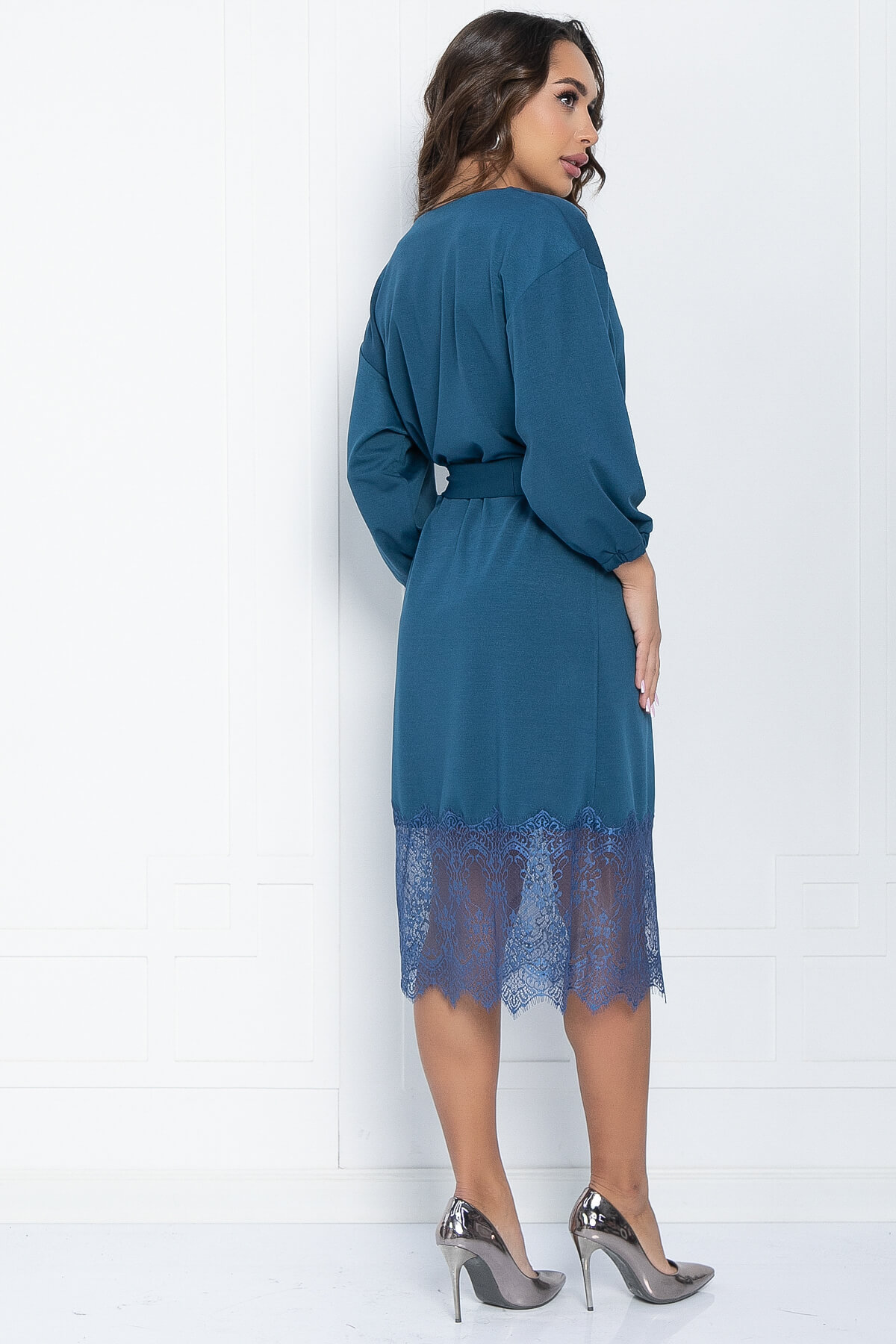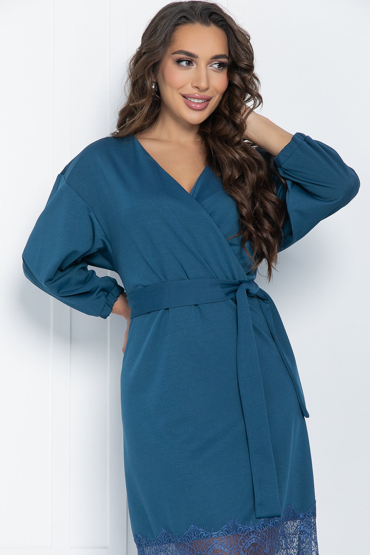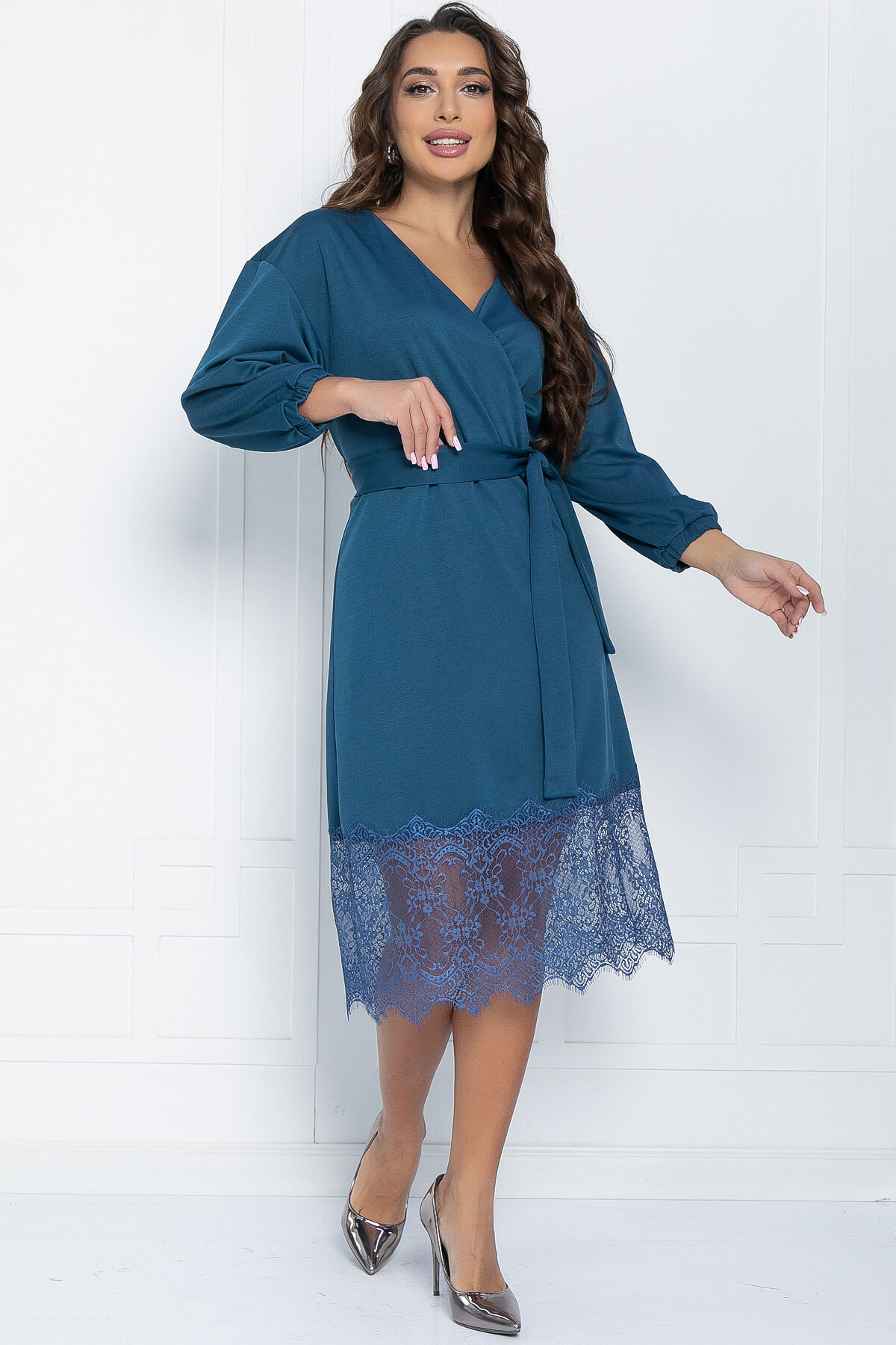 Летящее платье платье из трикотажа выглядит сдержано, но в то же время стильно и празднично. Изделие обладает акцентными элементами, которые придадут образу женственности. Элегантный вырез с имитацией запах подчеркнет зону декольте, по низу изделия широкое кружево, которое сделает акцент на ножках и визуально удлинит их. Рукав длинный со спущенным плечевым швом.