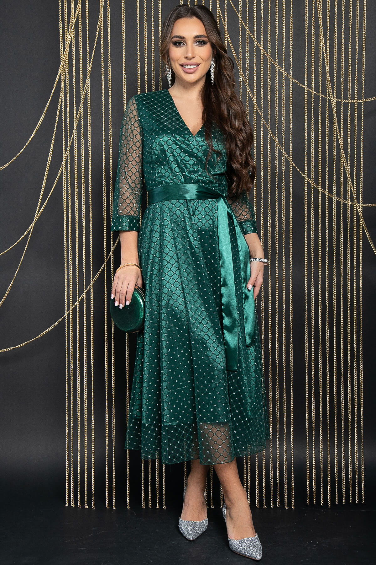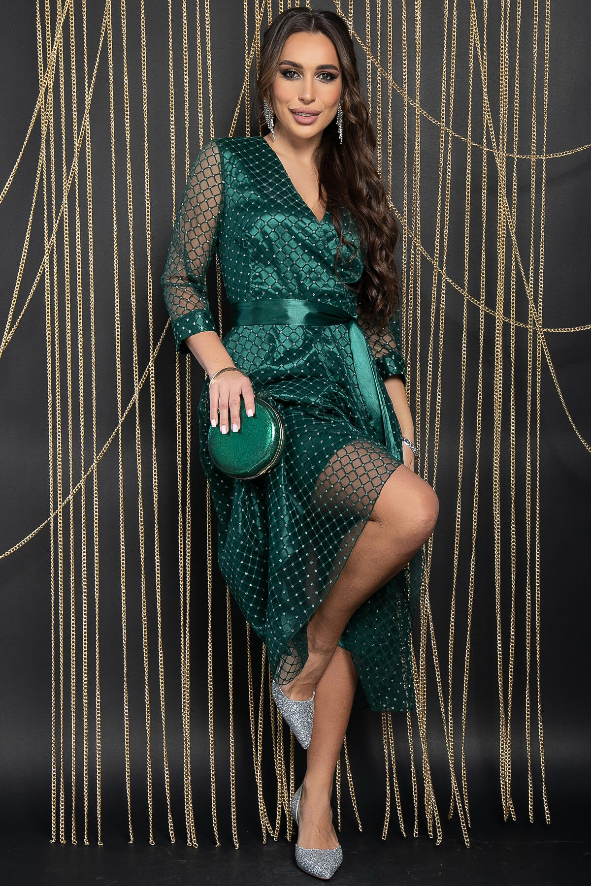 Летящее женственное платье украсит Ваш образ в новогоднюю ночь. Такая модель платья хороша тем, что актуальна на любом празднике, а также выглядит женственно, элегантно и празднично. Платье свободного кроя с длинным рукавом, по низу манжет. Имеет V-образный вырез с имитацией запаха, который подчеркнет вашу зону декольте. Изделие на подкладе. В комплект входит пояс из атласа.