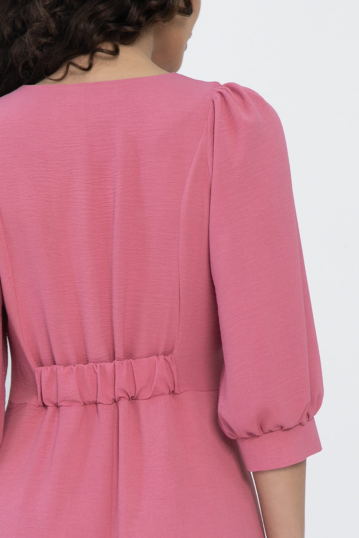 Платье средней длины с приталенным силуэтом станет настоящим украшением вашего гардероба! Благодаря отрезной линии талии оно подчёркивает фигуру, а расклешенная юбка придаёт образу лёгкость и женственность. Рукав-реглан средней длины на сборке завершается изящным манжетом, что делает платье ещё более утончённым. V-образная горловина добавляет в образ нотку изящества. Спереди платье украшено декоративным элементом в виде сборки, которую аккуратно закрывает втачной пояс. Сзади пояс аналогичный и собран на широкую резинку.