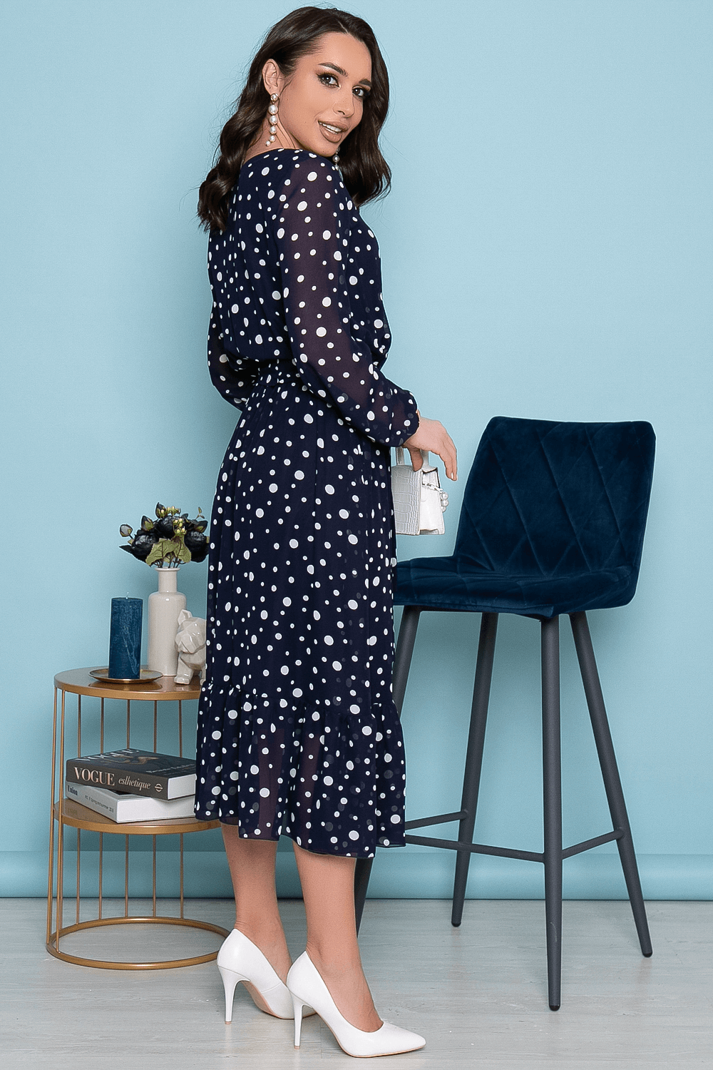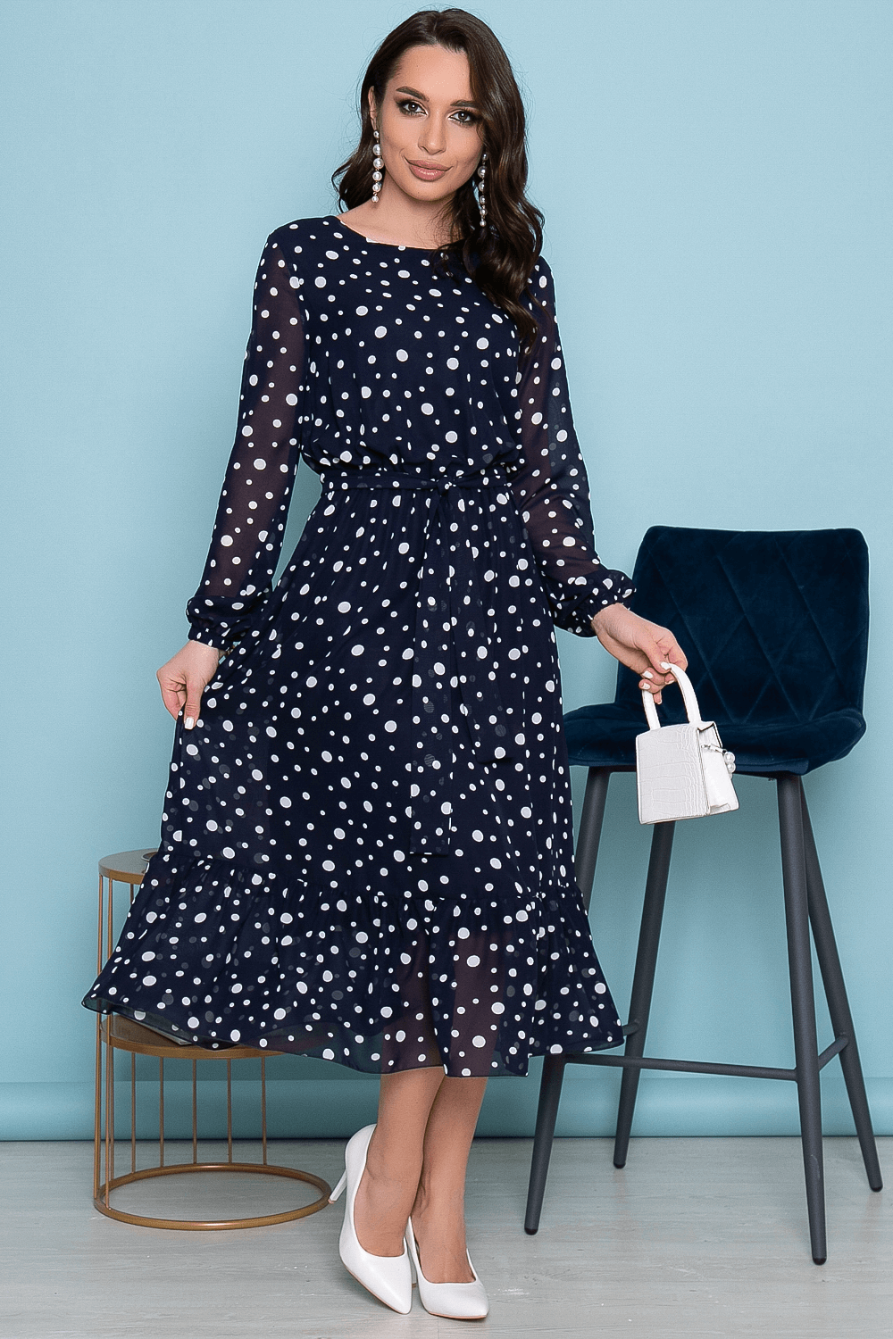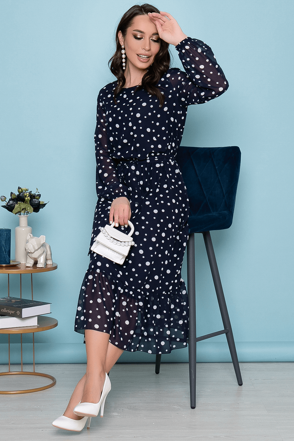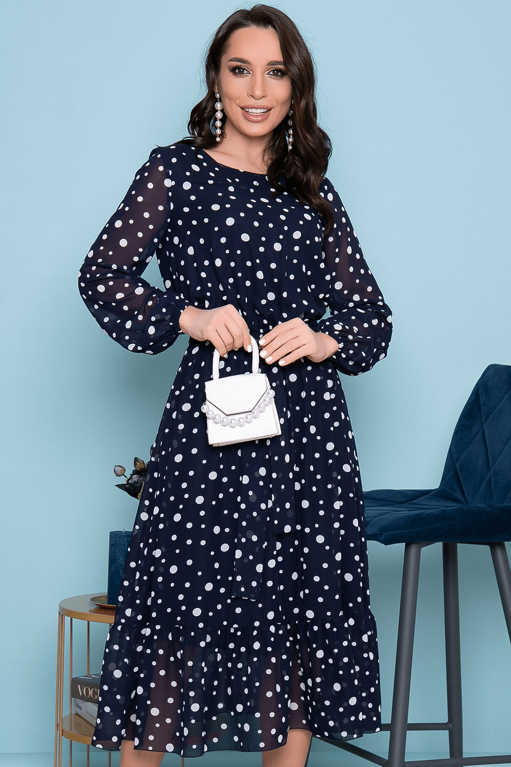 Платье из шифона в классическом синем оттенке! Самый женственный фасон платья с принтом "горох". Платье А-силуэта, талия на резинке. По низу юбки - широкий волан, рукав втачной, длинный, на резинке. Горловина - мягкая лодочка. Платье на подкладке, без замков. В комплекте пояс из основной ткани.
